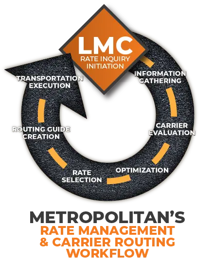 Metropolitan’s Load Management Center (LMC) powers our Rate Management & Carrier Routing services, offering an integrated rate management and carrier routing database. Our advanced rate engine automatically determines the optimal carrier based on your business rules, considering cost, transit time, equipment, performance, and service quality. Additionally, it provides easy access to centralized rate storage, maintenance, and real-time quotes.